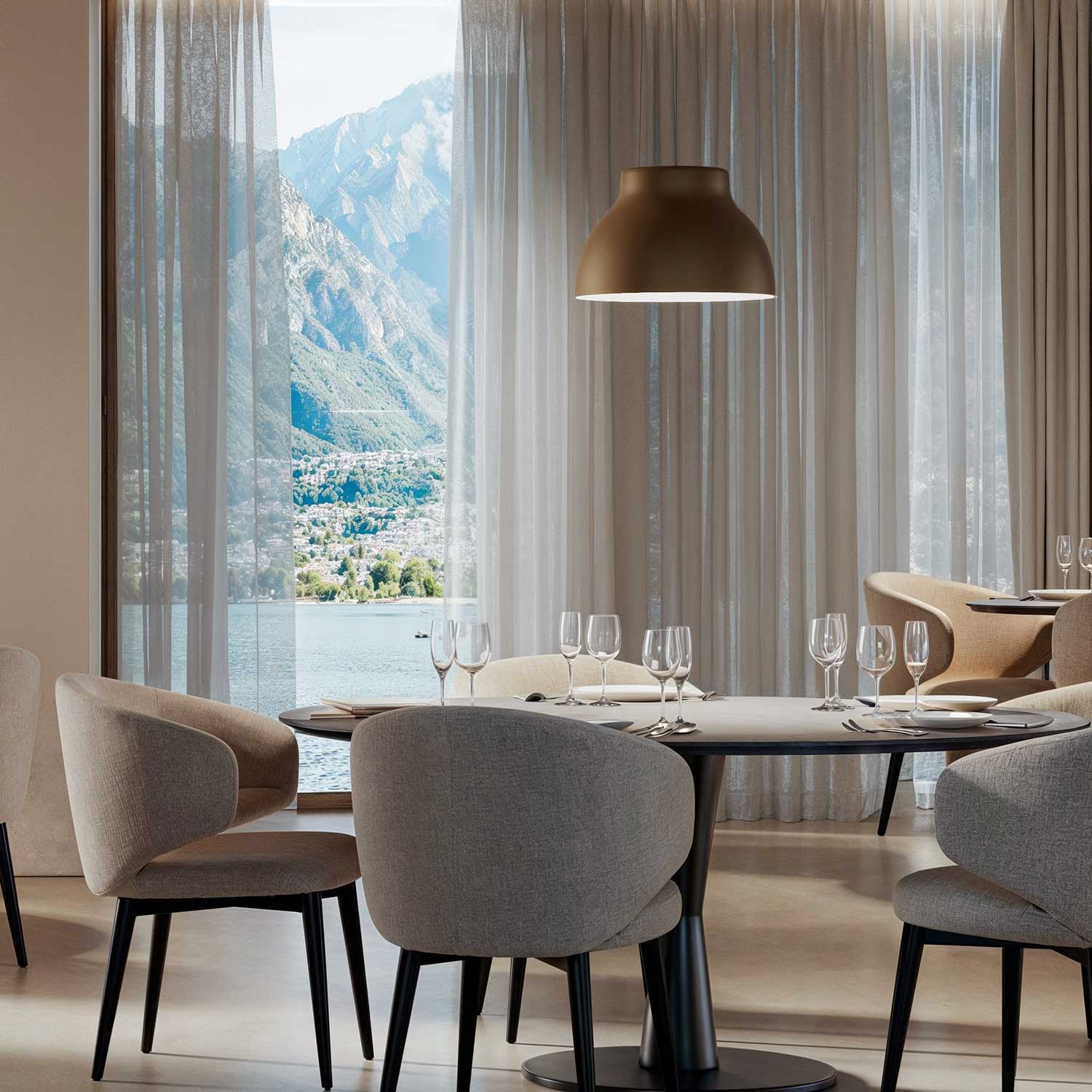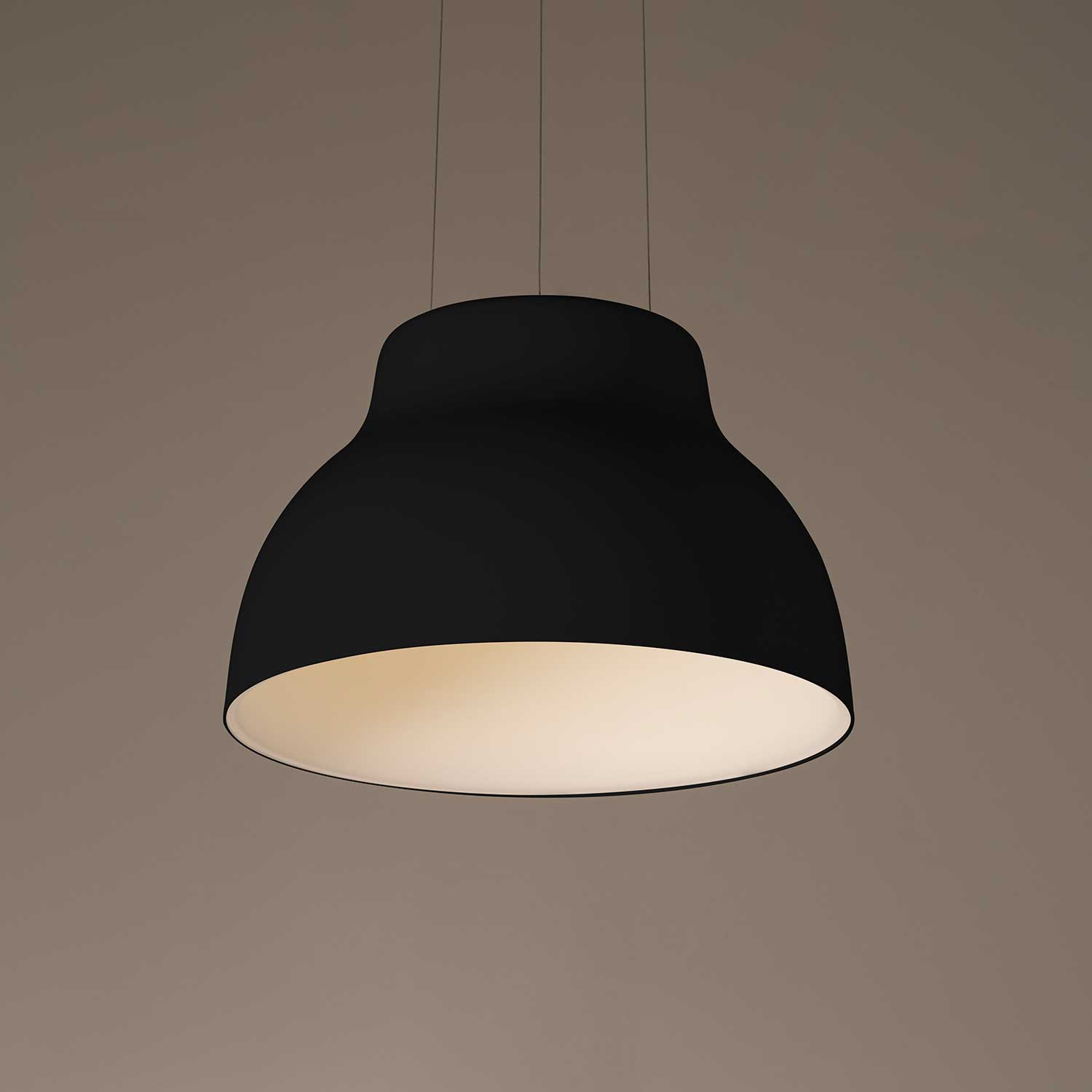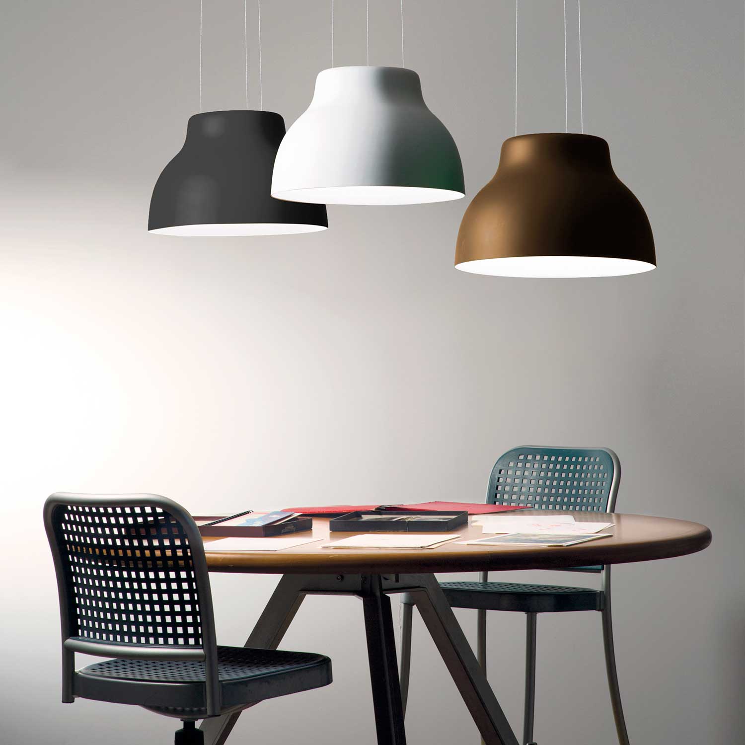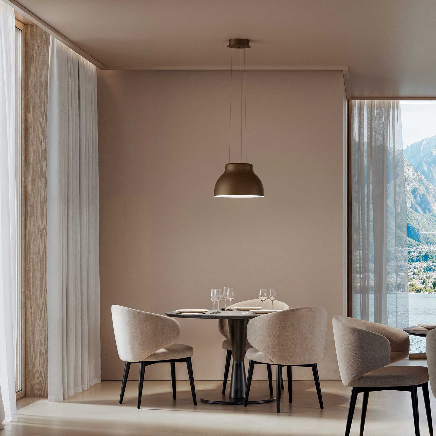 Cicala is an elegant pendant light that emits a pleasant, glare-free glow. The lamp is made of painted aluminium with an inner diffuser in white opal methacrylate, ensuring even and consistent illumination. The LED light source is integrated into the lamp, while the electronic driver is housed in the ceiling mount.